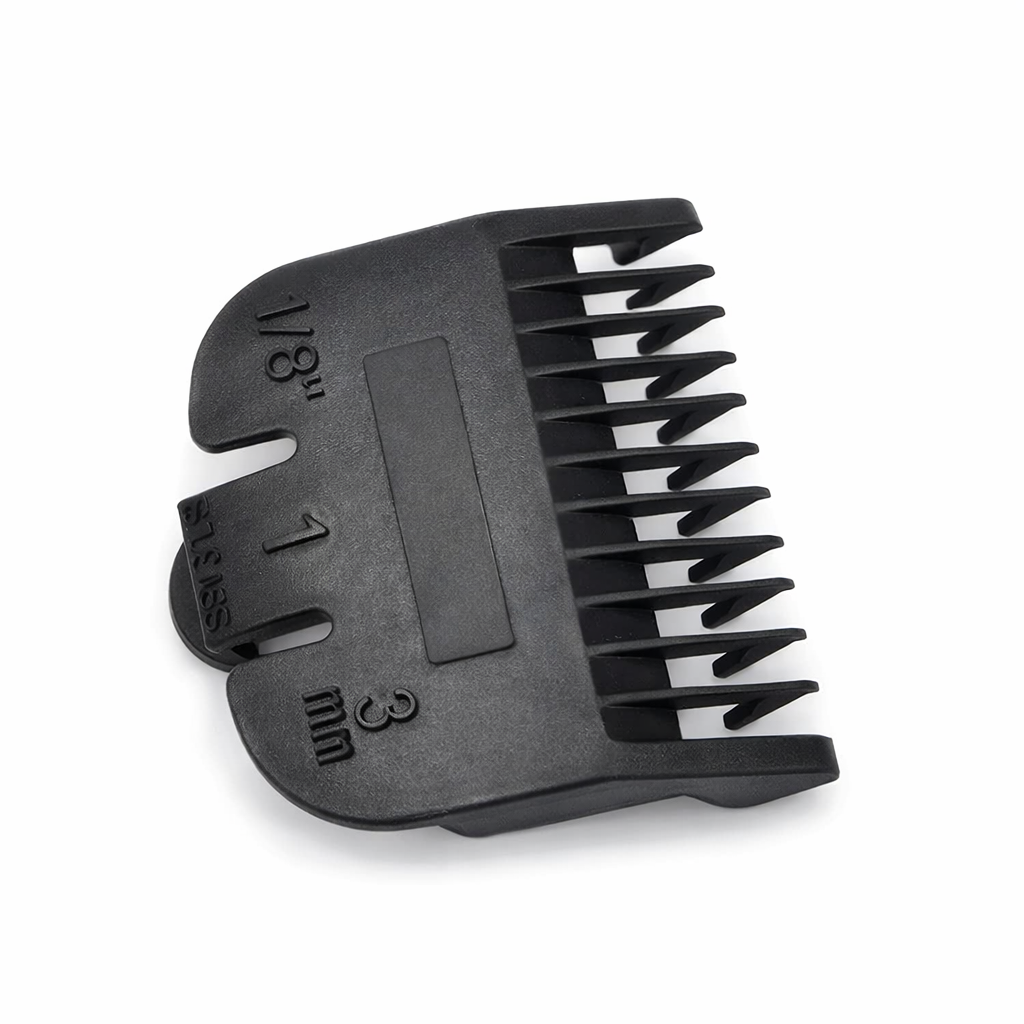 Fabricada en metal resistente, esta guía se coloca directamente sobre la cuchilla, ofreciendo un ajuste firme que mantiene la longitud del corte de manera constante. Su diseño sólido mejora la sensación de control y aporta mayor durabilidad frente al uso diario en barbería.